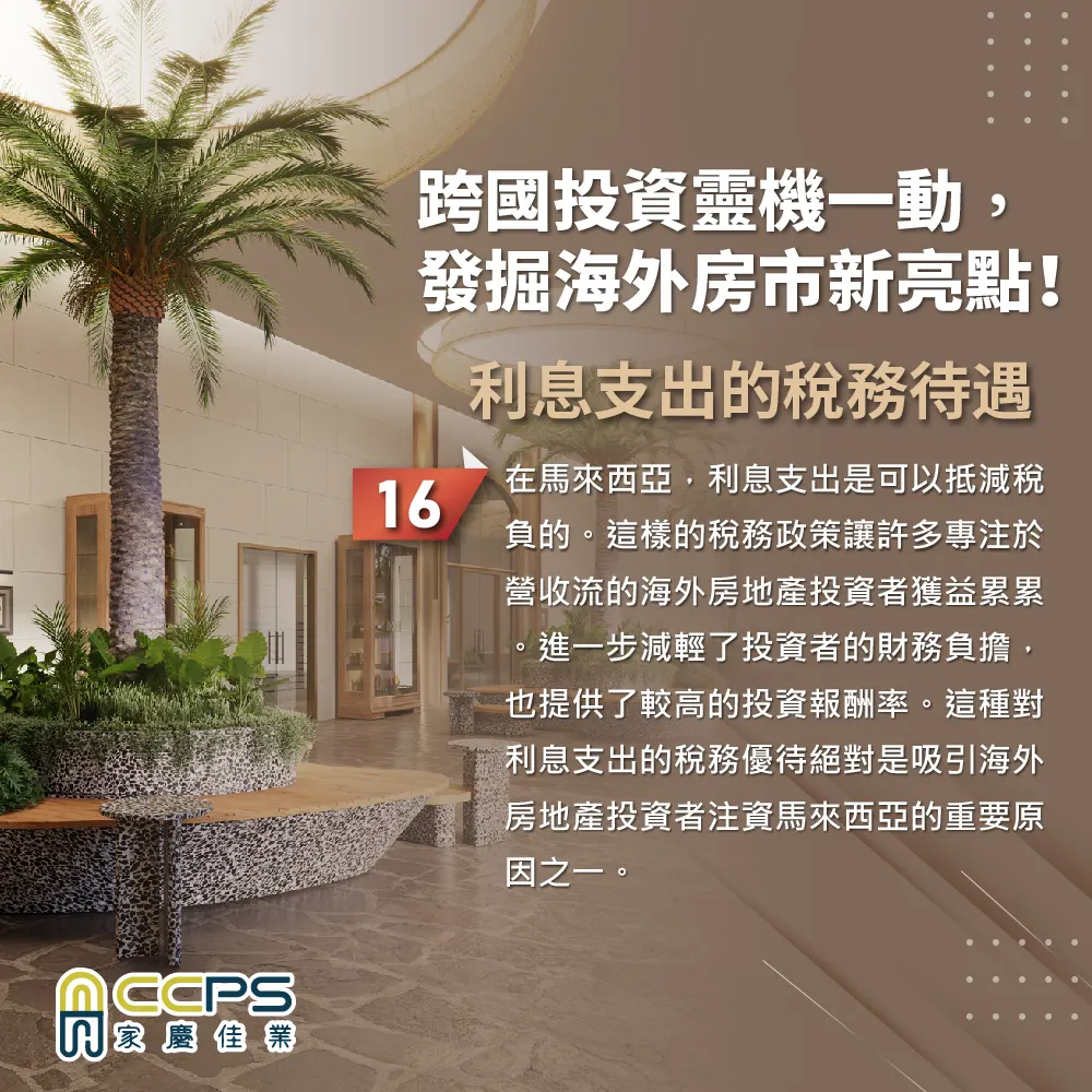 在馬來西亞,利息支出是可以抵減稅負的。這樣的稅務政策讓許多專注於營收流的海外房地產投資者獲益累累