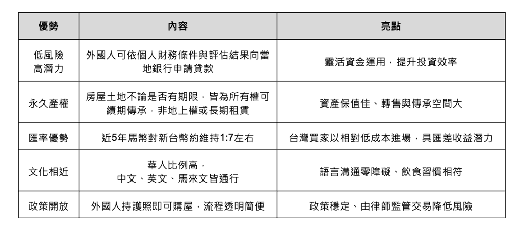 同時,台灣房市正值修正期,價格上漲力道不足,下修空間仍在,投資布局開始轉向海外尋求出口,再加上美中貿易戰推動全球產業加速南移,東南亞市場受到高度關注,其中政經局勢相對穩定的馬來西亞房產,更被視為穩健的「避險資產」選項。