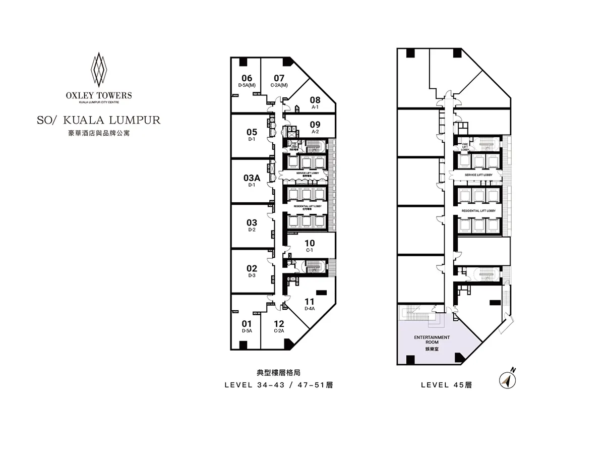 46樓:專健身房、瑜伽室、桑拿室、放映室、休息/閱讀室、多用途禮堂、空中花園、管理處。