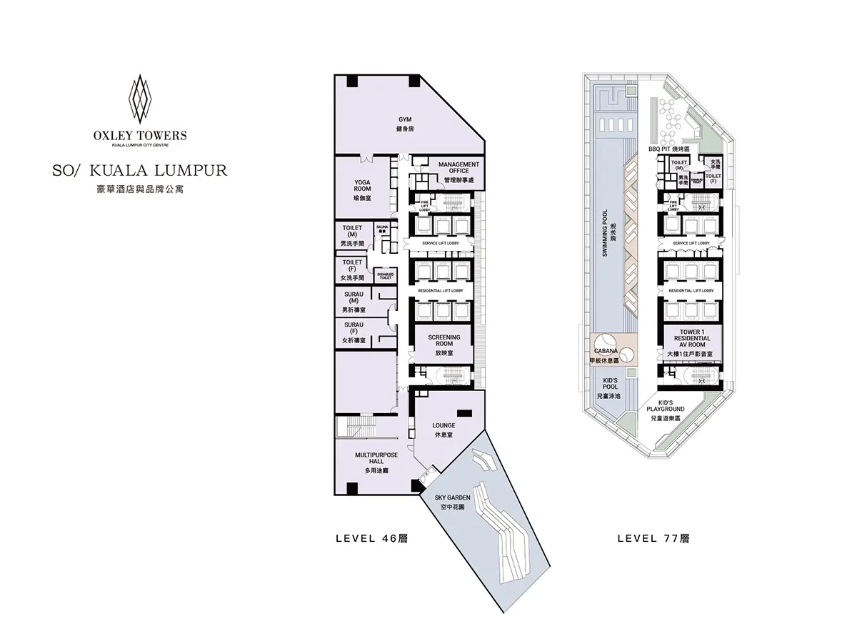 77樓 : 按摩浴缸、燒烤爐、更衣室、游泳池、小屋、兒童泳池、兒童遊樂園影音室。