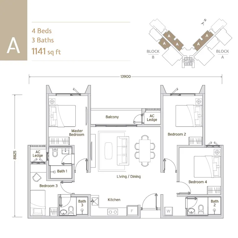 1,141 平方英尺 4 床 3 浴室1 陽台