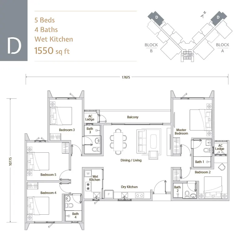 1,550平方英尺:5房4浴室1濕廚房1長陽台
